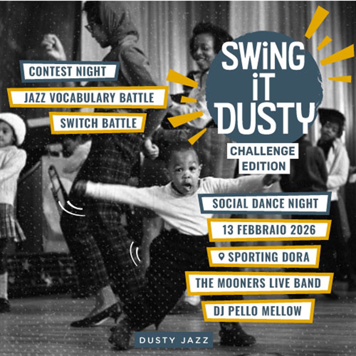 Due piste da ballo swing&blues, musica dal vivo, DJ set, battle di switch e solo jazz, shopping vintage e tanta energia Dusty: preparati a divertirti e a ballare fino a tarda notte!